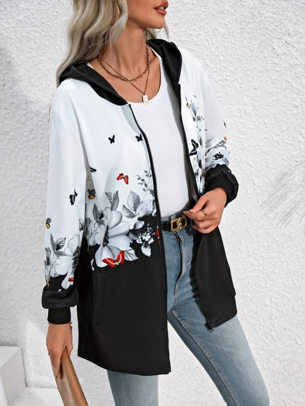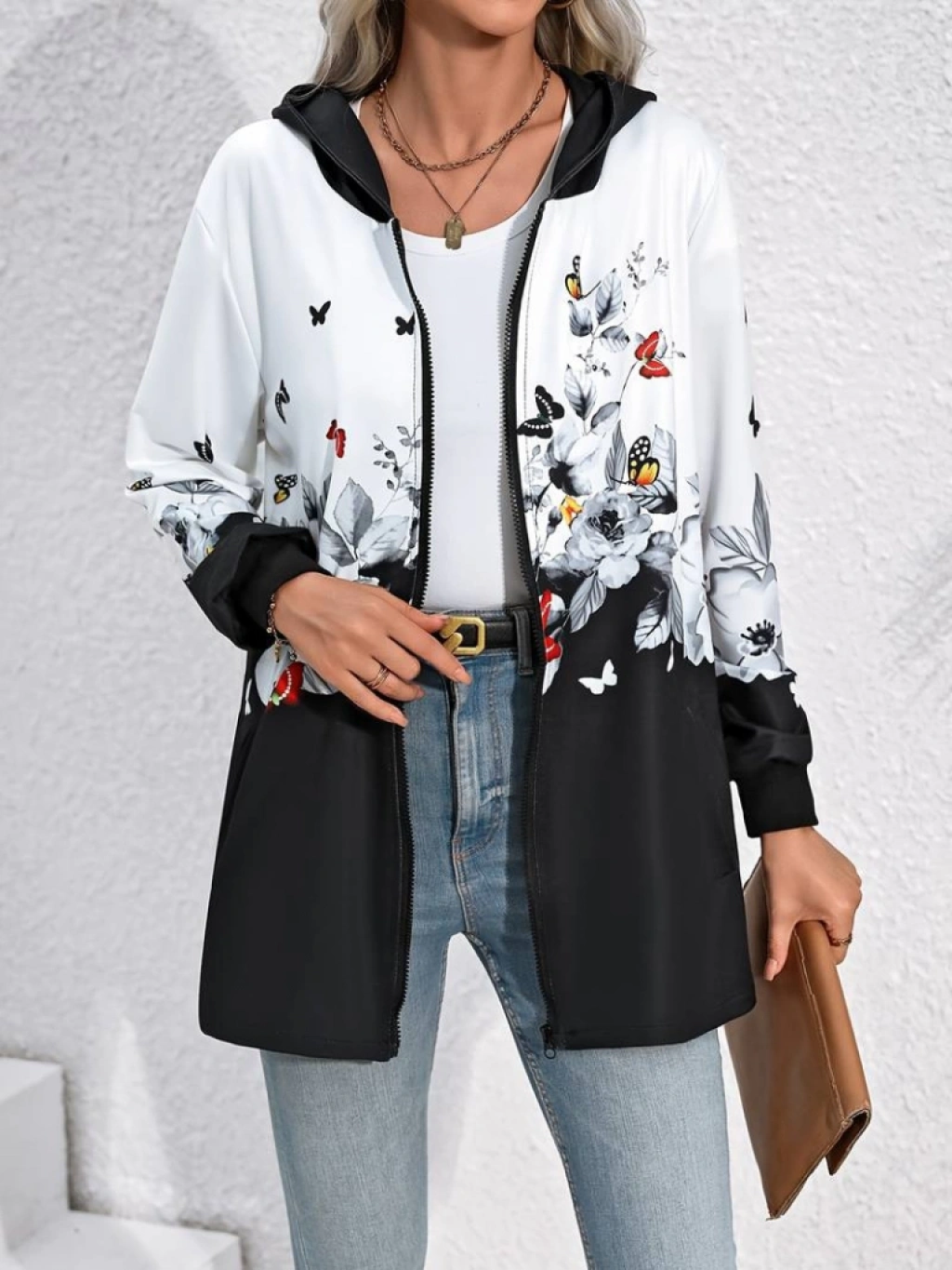Kadın Uzun Kollu Kapşonlu Fermuarlı çiçek-kelebek Desenli şardonlu Dalgıç Ceket