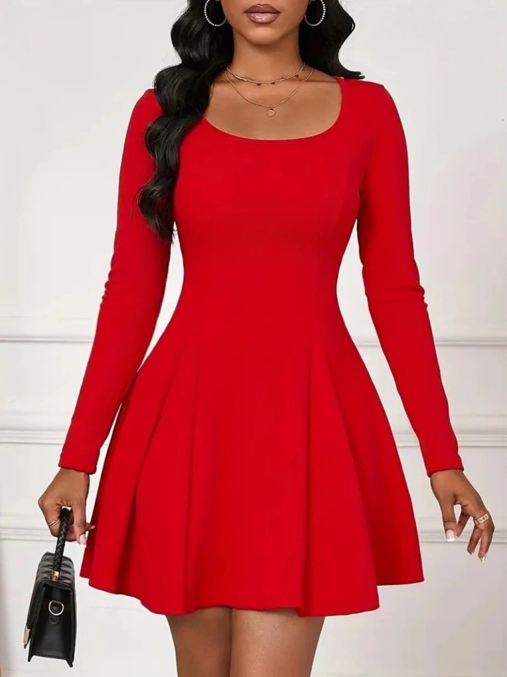 Kadın Uzun Kollu Kare Yakalı Mini Ithal Krep Elbise