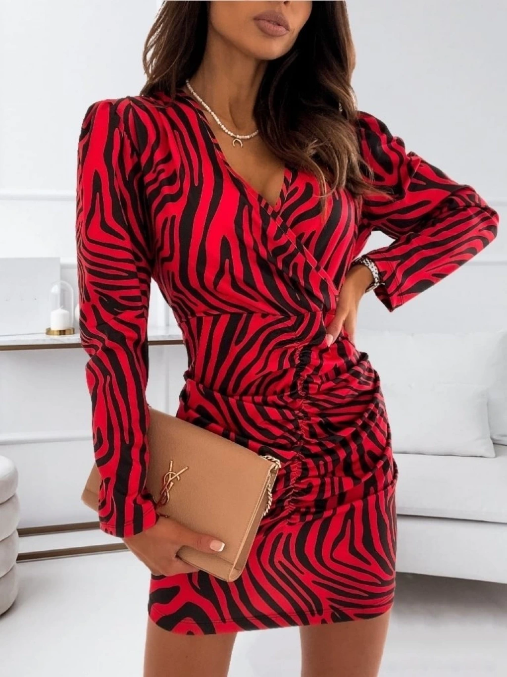 Kadın Uzun Kollu Kruvaze Yaka ön Kısım Büzgülü Dalgıç Mini Boy Elbise