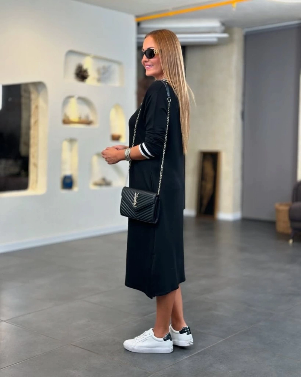 Kadın Uzun Kollu V Ribana Yakalı Yanlardan Yırtmaçlı Midi Viskon Iki Iplik Elbise