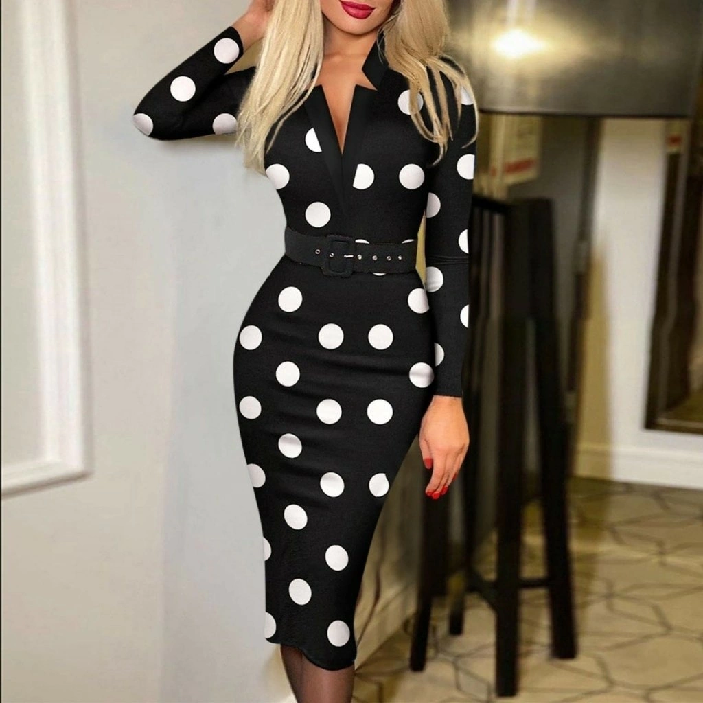 Kadın Uzun Kollu V Yaka Puantiyeli Krep Midi Boy Elbise