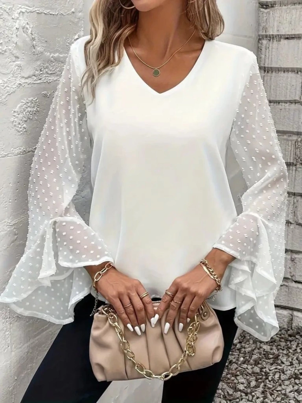 Kadın Uzun Kollu V Yakalı Kolları Ispanyol Detayı Sandy Bluz