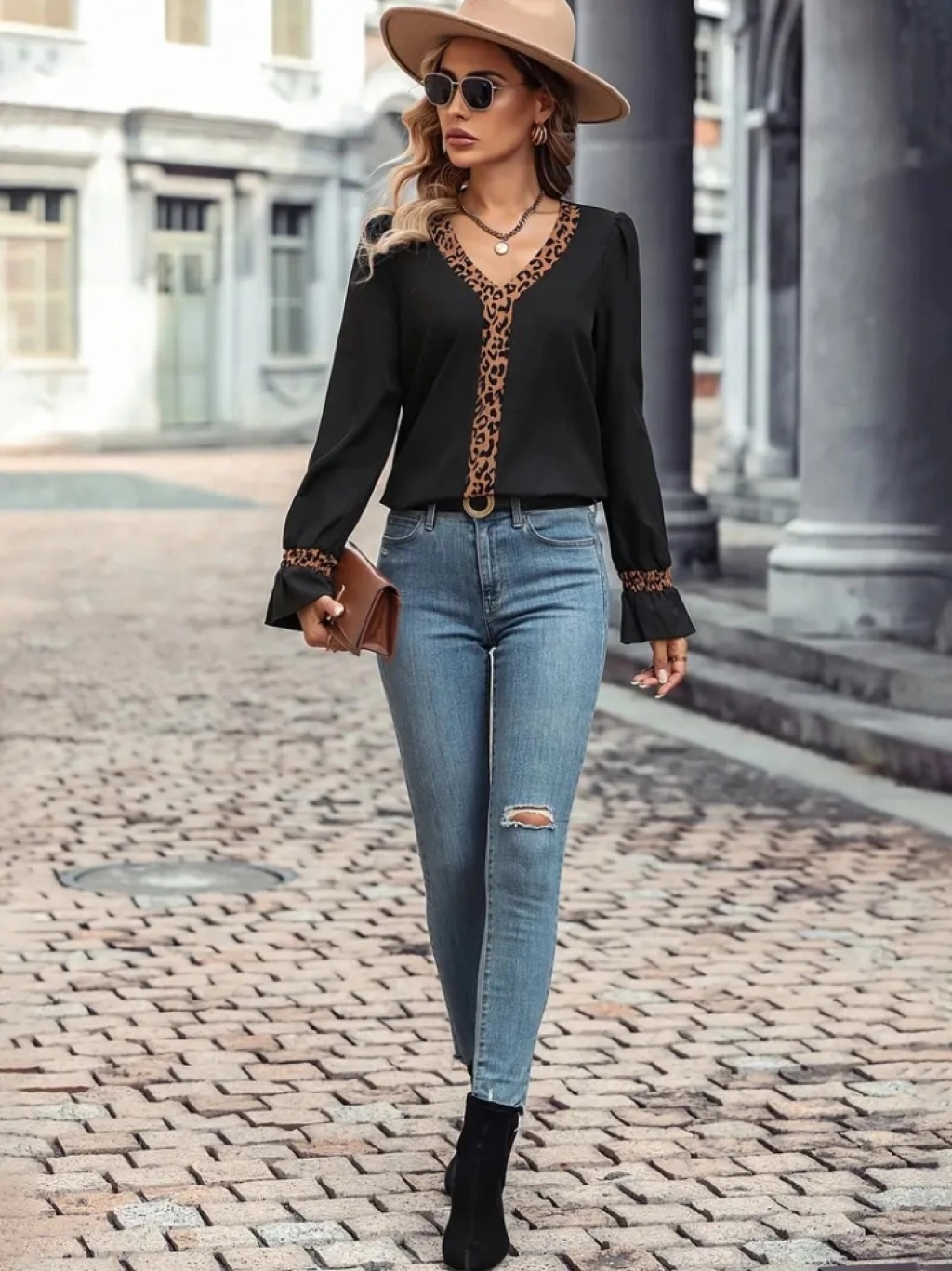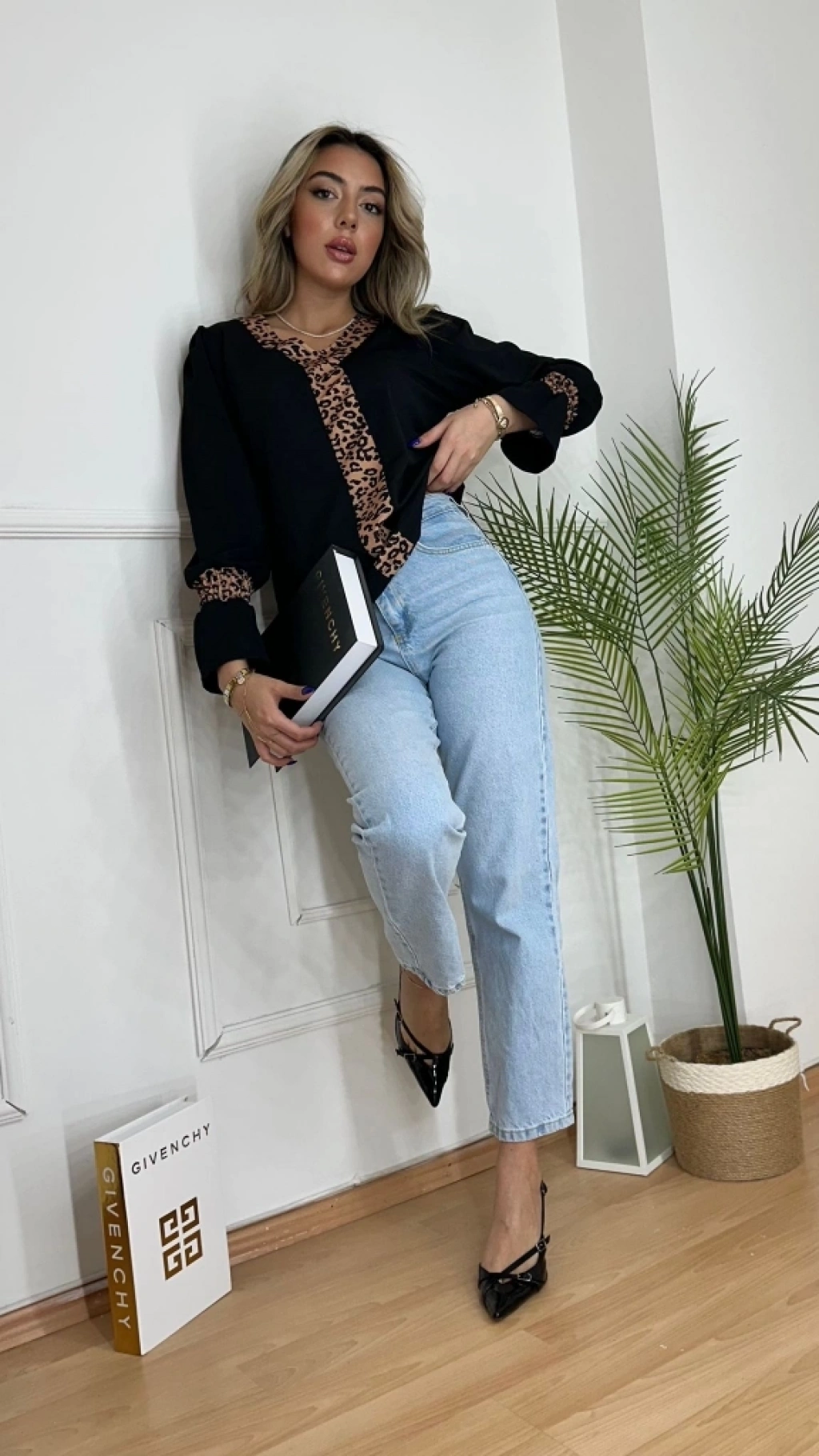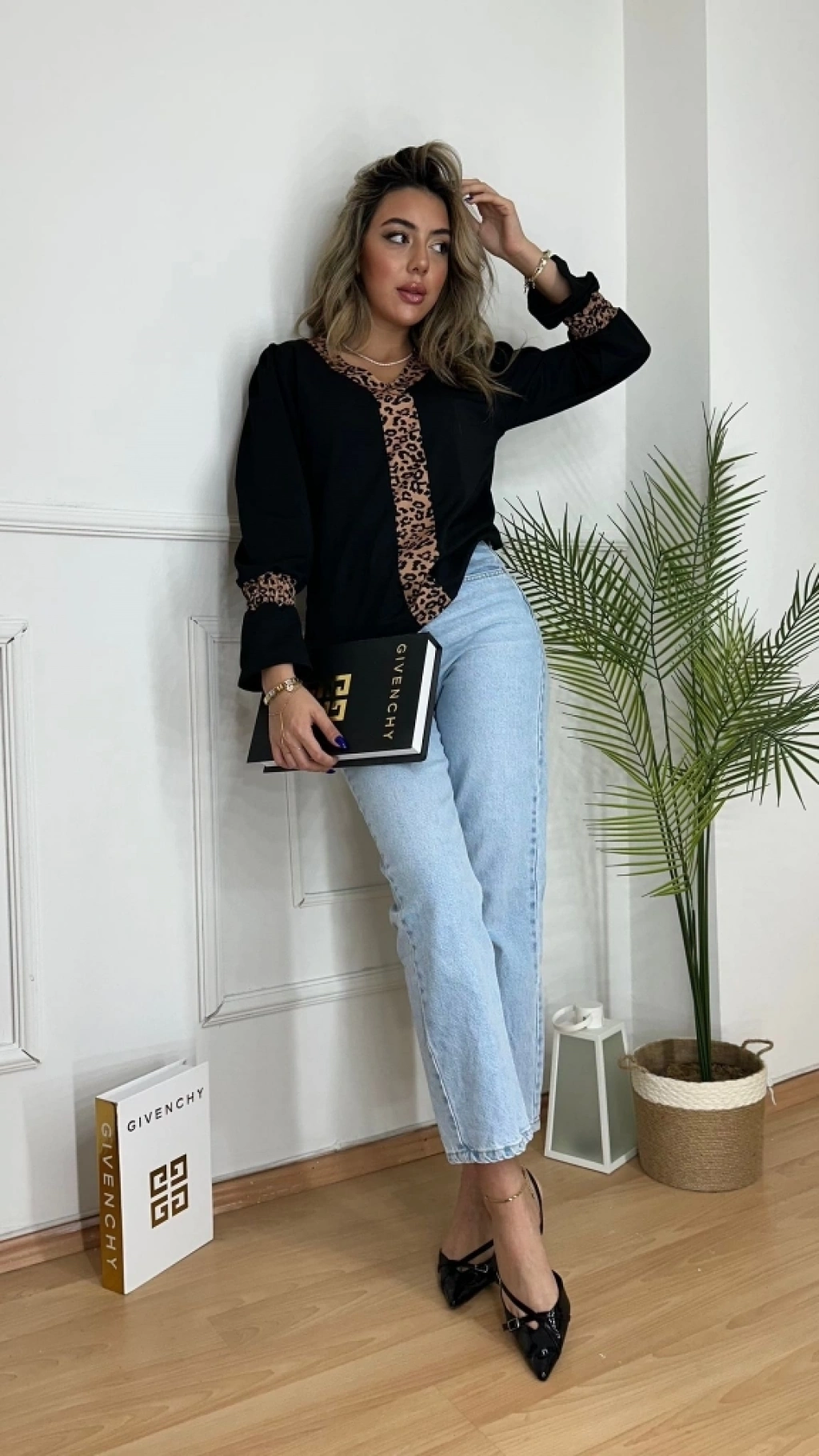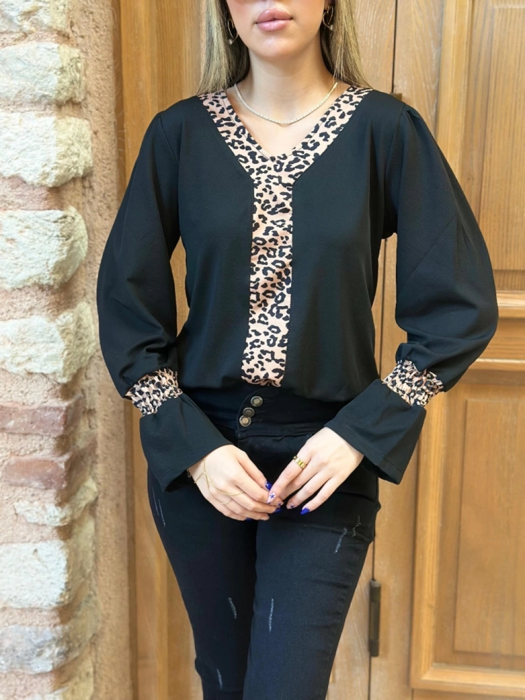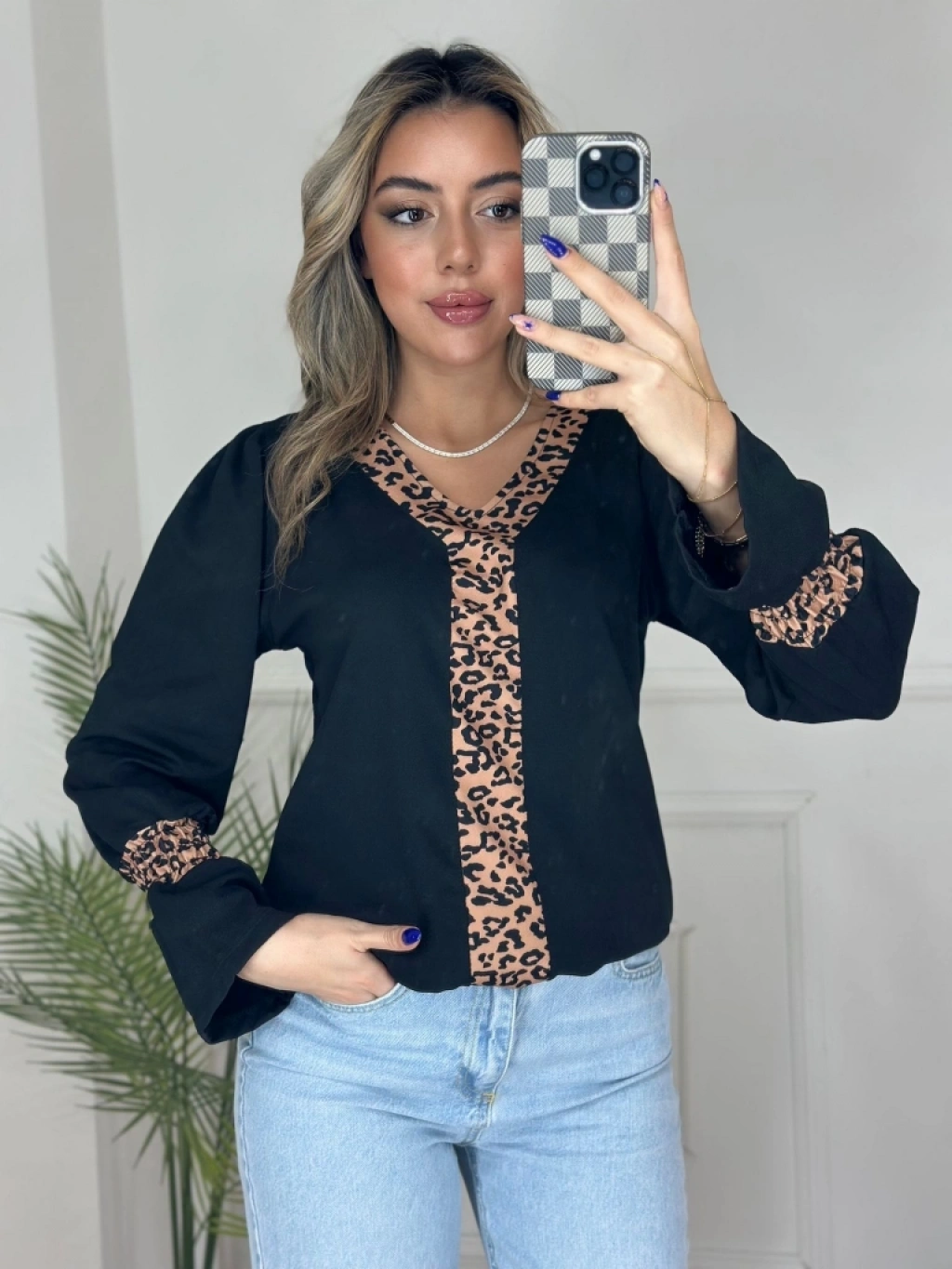 Kadın Uzun Kollu V Yakalı Leopar Detaylı Krep Bluz