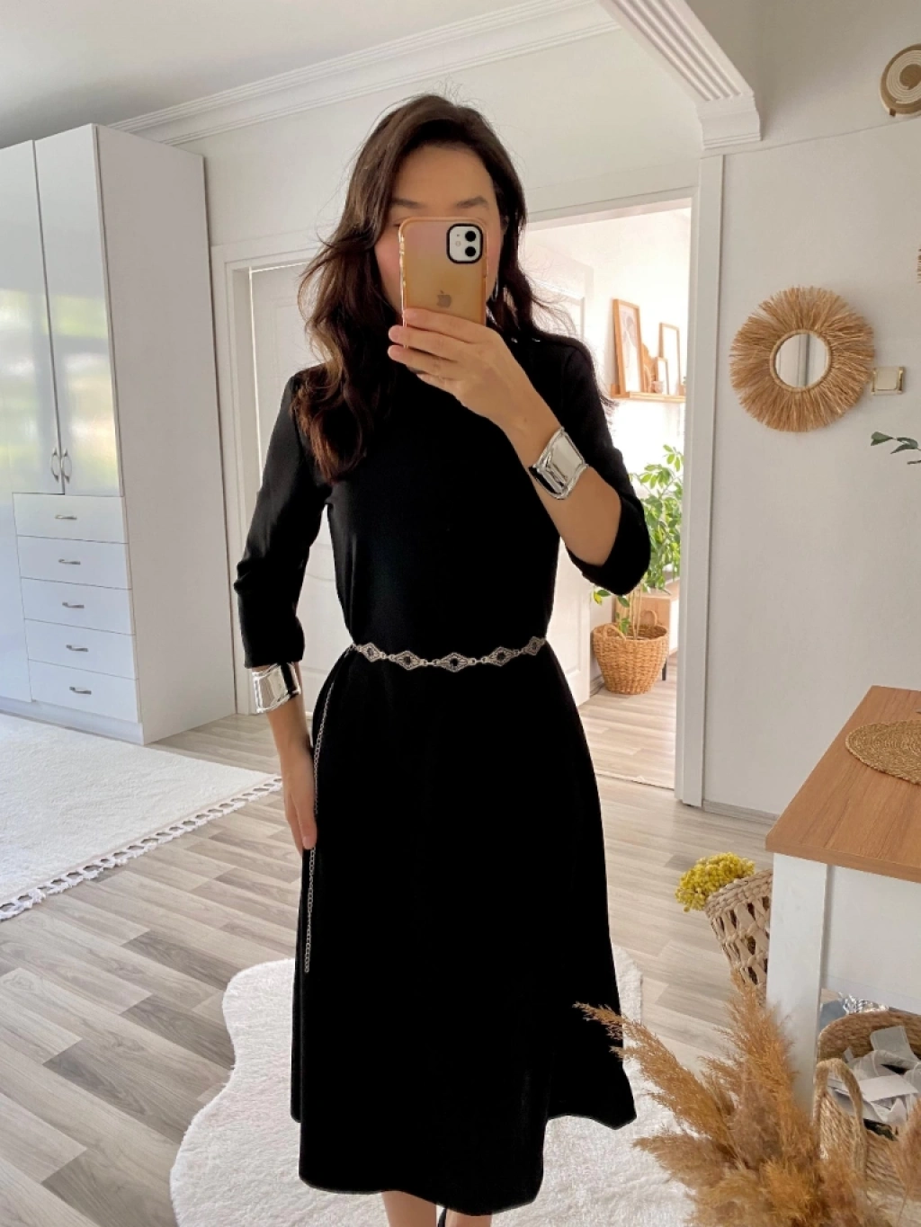 Kadın Uzun Truvakar Kol Bisiklet Yaka Midi Modal Elbise